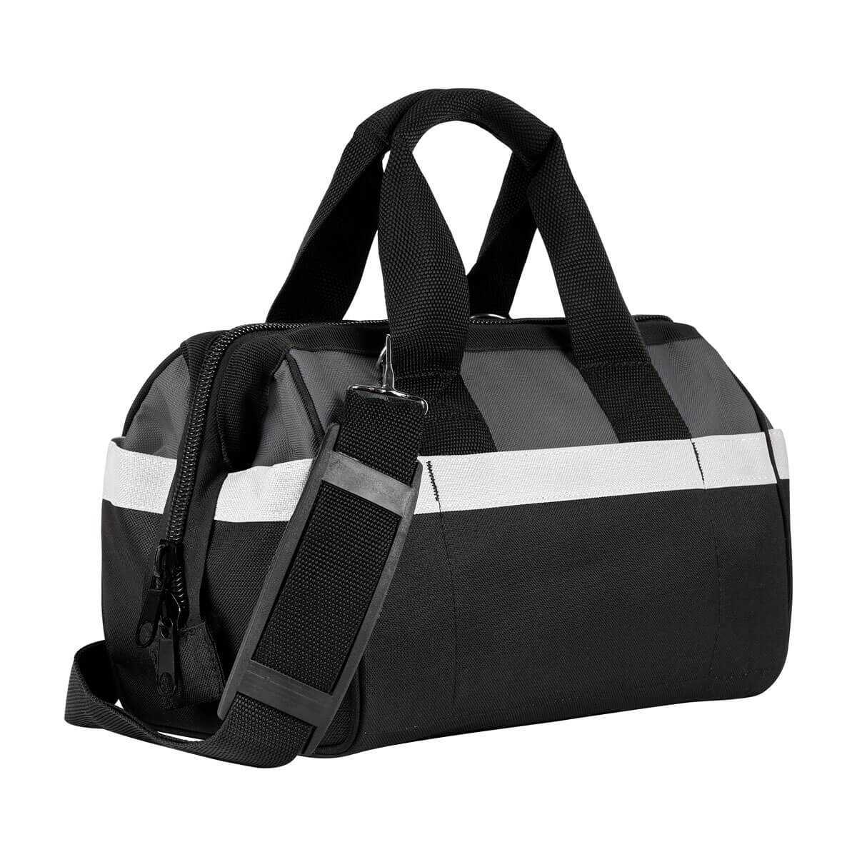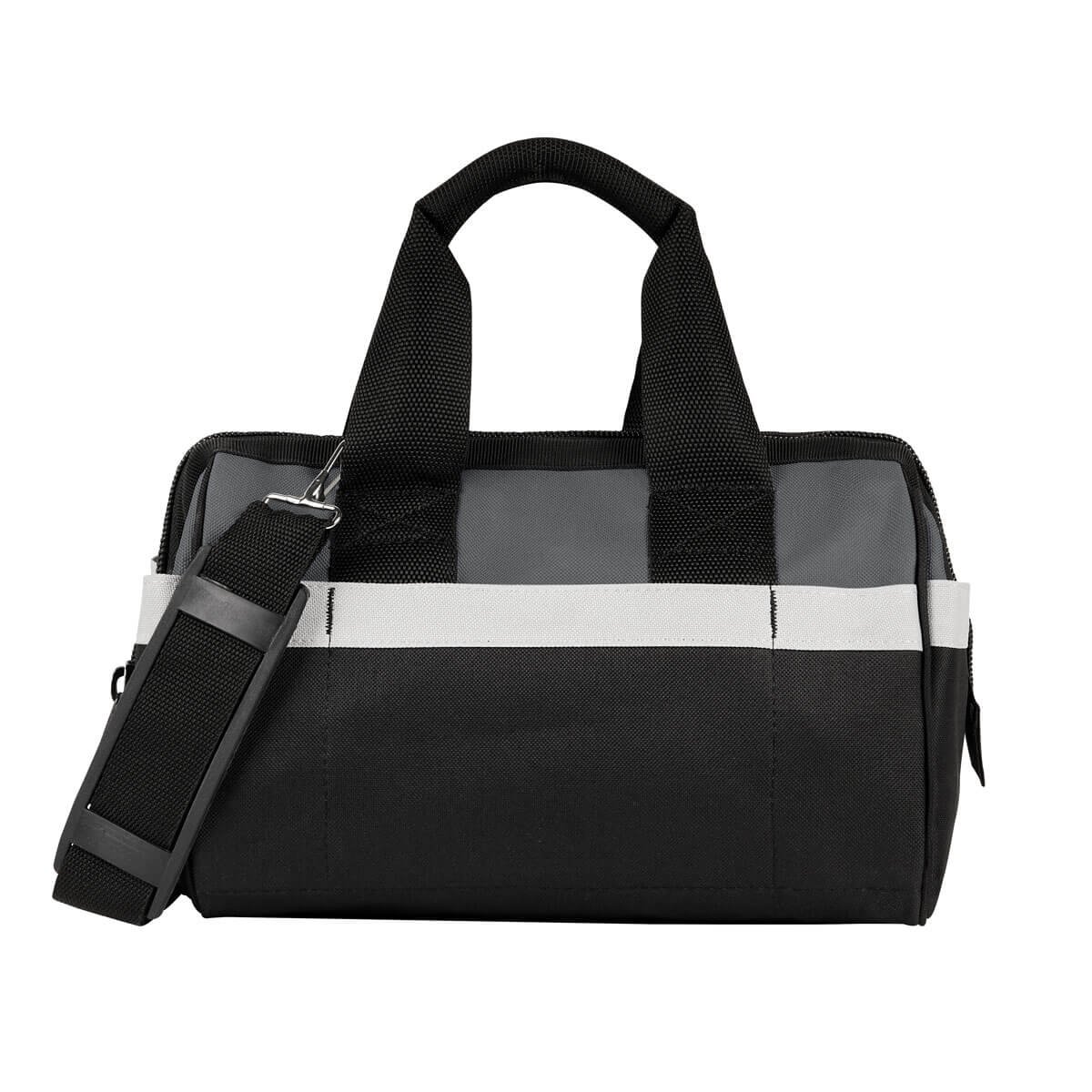Compartimento principal con cierre y varilla metalica la cual permite mantener la estructura de la bolsa. Su abertura extra ancha permite el facil acceso a las herramientas. 10 bolsillos internos y 10 externos. Incluye asas de mano y correa ajustable y removible con broche metalico para hombro.