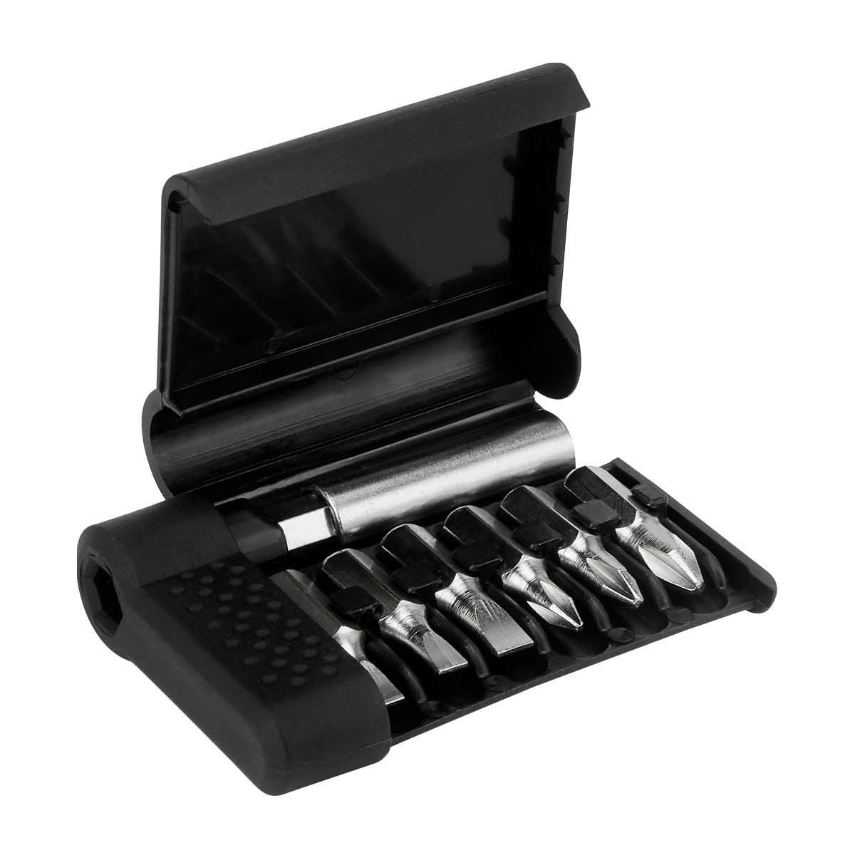 Contiene desarmador con 3 puntas planas, 3 puntas de cruz, diferentes e intercambiables. Incluye extension.