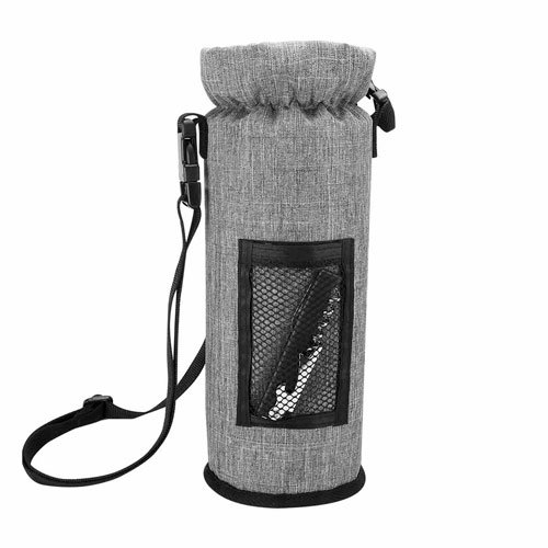 Bolsa con interior termico para botella de vino. Incluye sacacorchos con navaja y destapador y correa larga con broches.