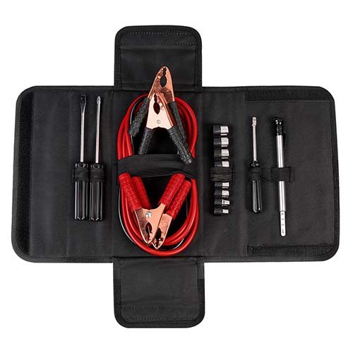 Contiene cables pasa corriente (100 amp), 9 dados, medidor de presion de aire, desarmador punta de cruz, desarmador punta plana, desarmador para dados. Incluye estuche de tela.