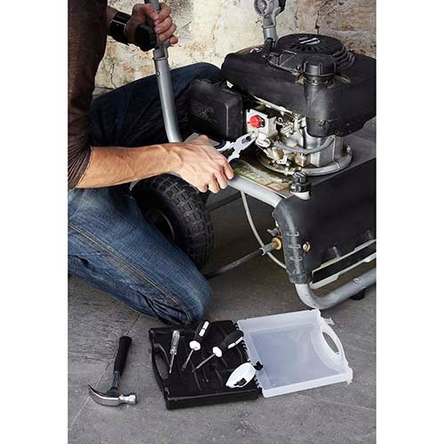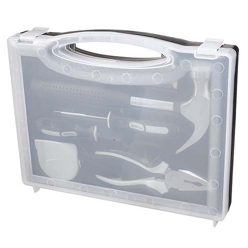 Contiene flexometro de 2 m, desarmador plano y de cruz, martillo, verificador de corriente y pinzas. Incluye estuche.