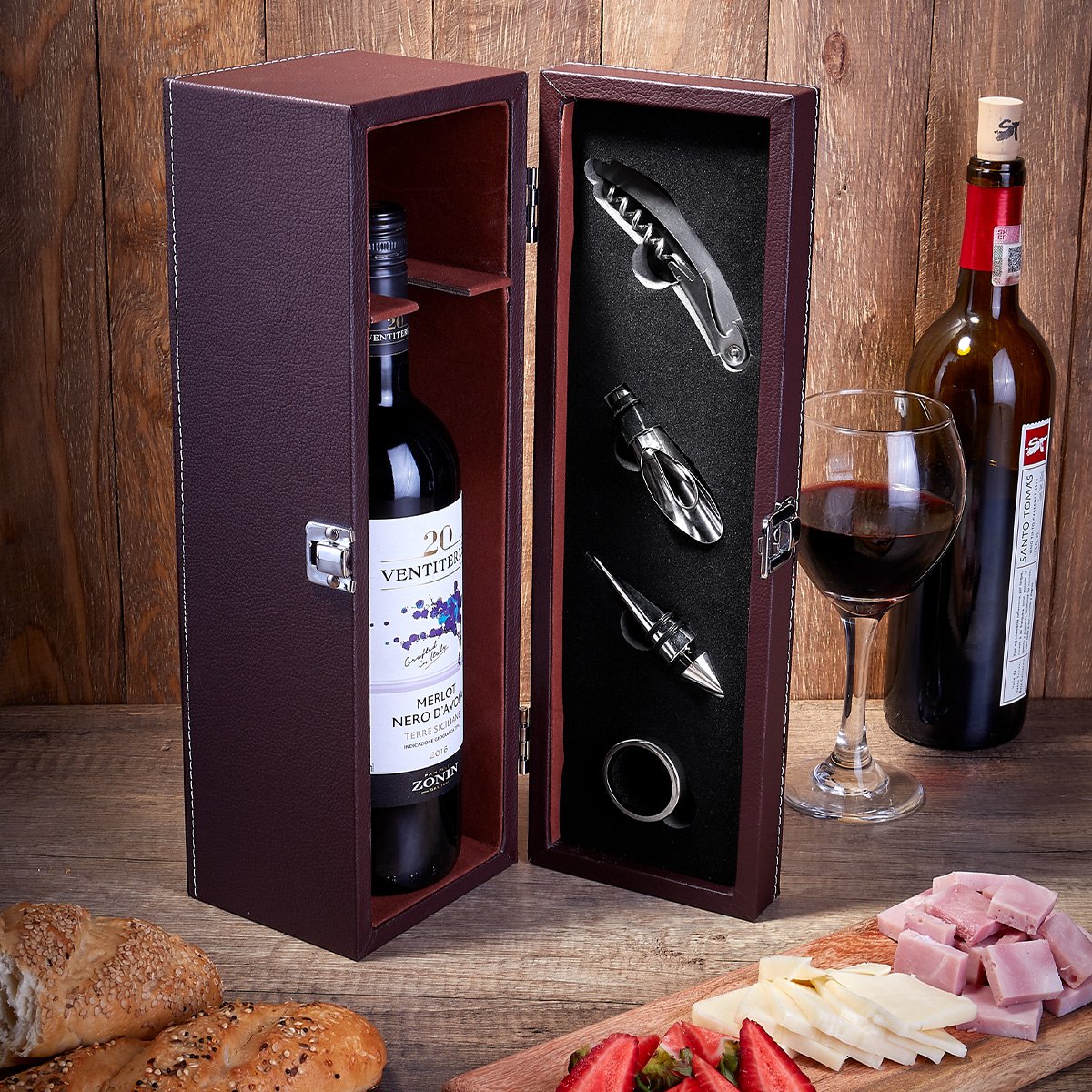 Incluye sacacorchos con navaja y destapador, stopper, boquilla, arillo y estuche con espacio para almacenar una botella (no incluida)